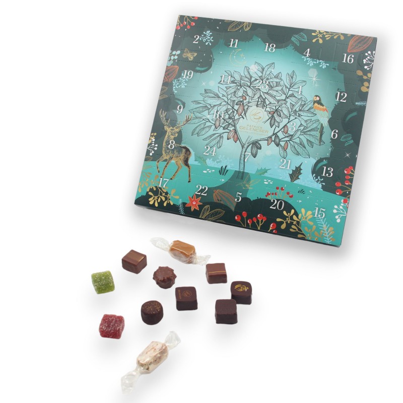 Ingrédients : chocolat noir maison 70% (fève de cacao, sucre, beurre de caca, lécithine de tournesol), chocolat au lait maison 32% (sucre, poudre de lait entier, beurre de cacao, fève de cacao, lécithine de tournesol), chocolat blanc 26% (sucre, beurre de cacao, poudre de lait entier, lécithine de soja, arôme naturel de vanille), huile essentielle d'orange (chocolat orange), praliné (sucre, amande, noisette), feuilletine (farine de blé, matière grasse laitière anhydre, lactosérum en poudre, farine de malt d'orge, poudre à lever ), caramel (sucre, glucose, crème, lait, beurre, sel de Noirmoutier, gousse de vanille de Madagascar), nougat (amande, sucre, glucose, miel de Vendée, pistache, blanc d'œuf, vanille naturelle), pâtes de fruit (sucre, purée de fruit, glucose, pectine, acide citrique, colorant vert E133 pour la pomme, pulpe de fruit (framboise, fraise, abricot, exotique, pomme, myrtille)), nougatine (amande, sucre et glucose), poudre de framboise, denrées alimentaires colorantes fabriquées à base de plante de carthame, citron, radis, cassis, pomme et algue spiruline.