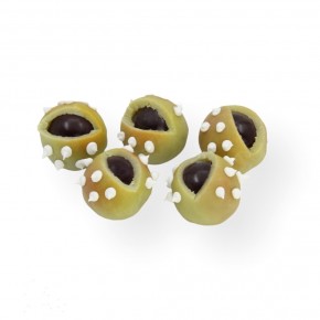 Bouchée chocolat noir, garnie d'une onctueuse crème de marrons, enrobée de pâte d'amande